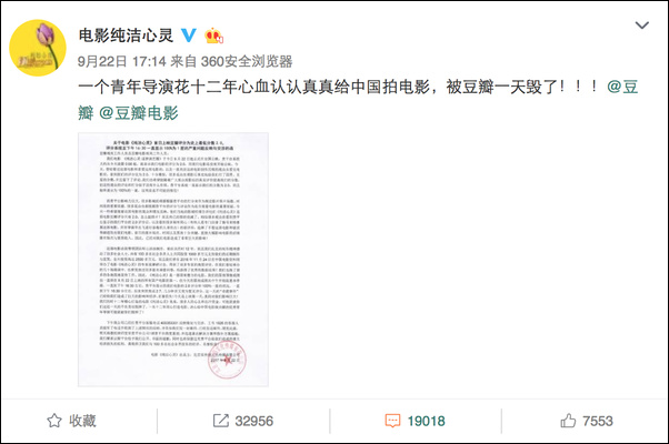 这种愤怒又直接导致了当天@电影纯洁心灵 发布了至豆瓣的交涉函,声称“一个青年导演花十二年心血认认真真给中国拍电影,被豆瓣一天毁了”,这句话后边是3个大大的惊叹号。在描述这个过程时,毕志飞用了“我们当然要”这个表述,可见他至今仍然愤愤难平。