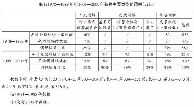 广义的中国正义体系是由三大传统组成的。一是来自古代的“中华法系”传统,包括其非正式正义体系,特别是社区的调解体系——今天,在全社会每年共约1000万起(有记录的)纠纷之中,每两起仍然有一起是通过社区“人民调解”解决的(见表1)。而在西方,真正的中国式的和解,最多只达到法院处理案件中的几个百分点(在美国低于2%;在调解更为发达的荷兰,也才3%)。再则是中华法系中的行政与法律的长期交织,如今仍然非常明显。二是清末民国以来从西方,尤其是大陆法系移植过来的成文法律,包括其权利理论和话语,以及经过法律逻辑整合的众多法则和条文。这是主宰当今民法典编纂的主要传统。三是20世纪中国革命的传统,包括其党国政治体制和社会主义话语,至今同样仍然十分明显。同时,还有其与古代和引进的两大传统相互作用而形成的大规模“半正式”调解,主要是法院调解和行政调解——在其近年处理的年均约1500万起纠纷中,每三起有一起是调解结案的(见表1)。也就是说,当前的正义体系在实际运作的层面上,明显同时含有以上三大传统“多元”的方方面面,其间既有分别并存,也有互补结合,更有相互作用和融合。当然,也不可避免地带有拉锯、摩擦、碰撞、矛盾,包括滥用和腐败。