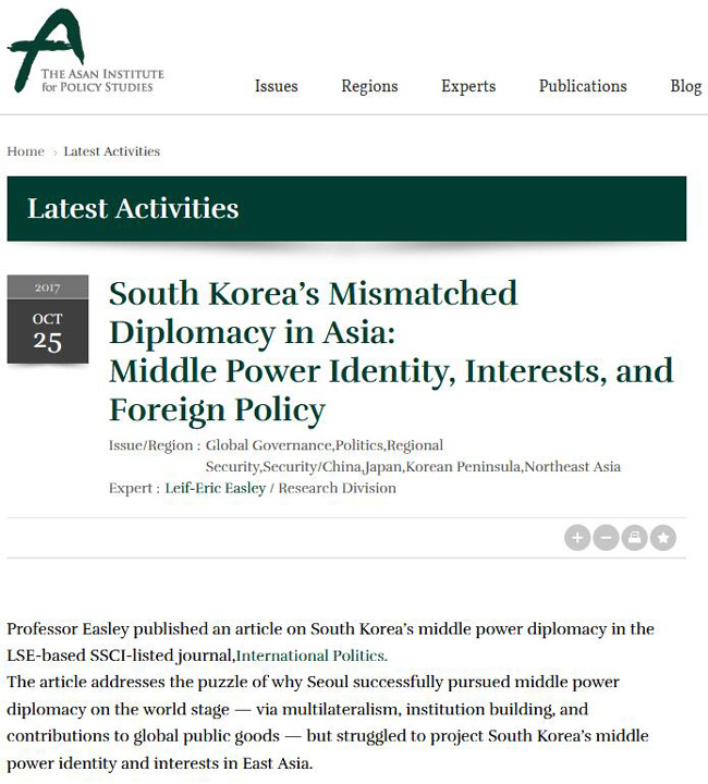 韩国峨山政策研究院访问学者、梨花女子大学助理教授列夫-艾瑞克·伊斯礼文章:《韩国亚洲外交政策的错配:中等强国的身份定位、利益诉求与外交政策》