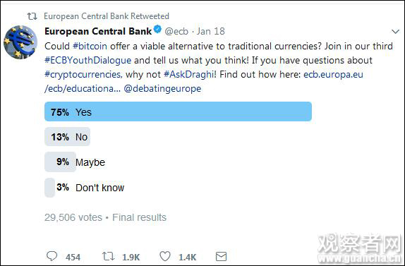 加密货币在过去一年大幅上涨,已经引起了各国央行的高度关注。我国已在去年酝酿推出法定数字货币;据中金网消息,欧洲央行也在本月较早时候,征求推特用户关于“比特币能否成为传统货币的替代品?”的意见。截止30日,有75%的参与调查者选择了“是”。