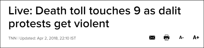 《印度时报》报道称,目前已造成至少9人丧生。当天,印度警方表示,这9人中大部分是在骚乱中被警方开枪打死的,其中中央邦有6人死亡,拉贾斯坦邦、北方邦和古吉拉特邦各有1人死亡。