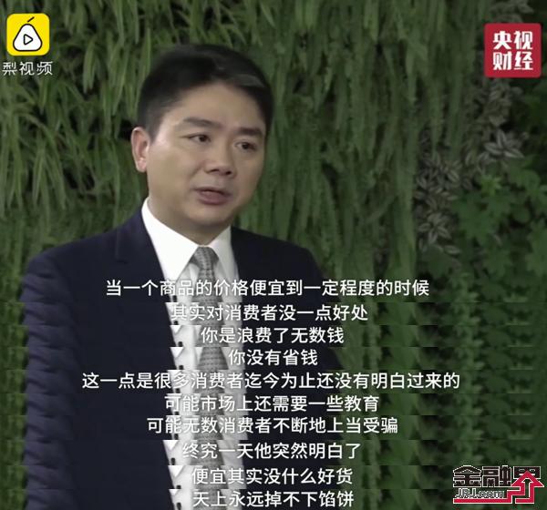 刘强东补充到,当一个商品的价格便宜到一定程度的时候,其实对消费者没一点好处,是浪费了无数钱,没有省钱。“这一点是很多消费者迄今为止还没有明白过来的,可能市场上还需要一些教育,可能无数消费者不断地上当受骗,终究一天他突然明白了,便宜其实没什么好货,天上永远掉不下馅饼。”值得注意的是,刘强东曾经表示,某友商这些低价的产品和京东销售的产品产生冲突的很少,其用户群和产品质量与京东不属于同一个等级。