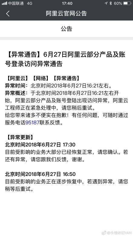 阿里云官网下午17:30发布公告,目前受影响的业务已经恢复正常,请确认。