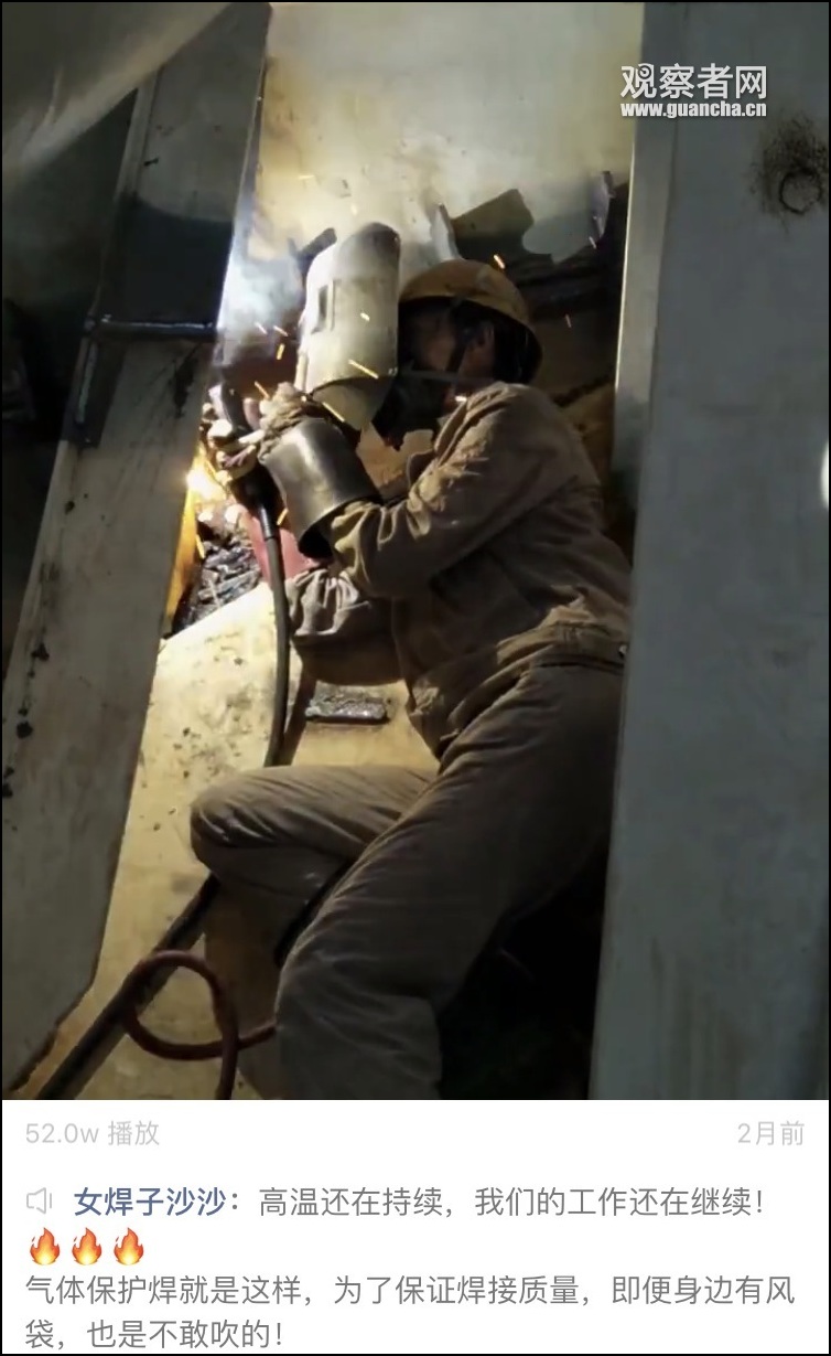 而更多人了解到她,是因为她在快手上与大家分享自己的生活。没有哗众取宠,她的快手视频里都是火花四射的焊枪、缓慢行驶的巨大轮船,和她穿着工作服戴着安全帽的纤瘦身影。就是这样看似“乏味”的内容,却让50多万粉丝关注了她,大家在直播间里互相交流讨论电焊技术,对沙沙充满钦佩。
