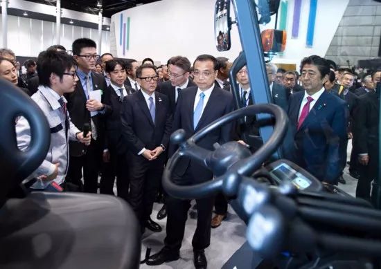 国务院总理李克强当地时间5月11日上午在日本首相安倍晋三陪同下,来到位于苫小牧市的丰田汽车北海道厂区参观考察。
