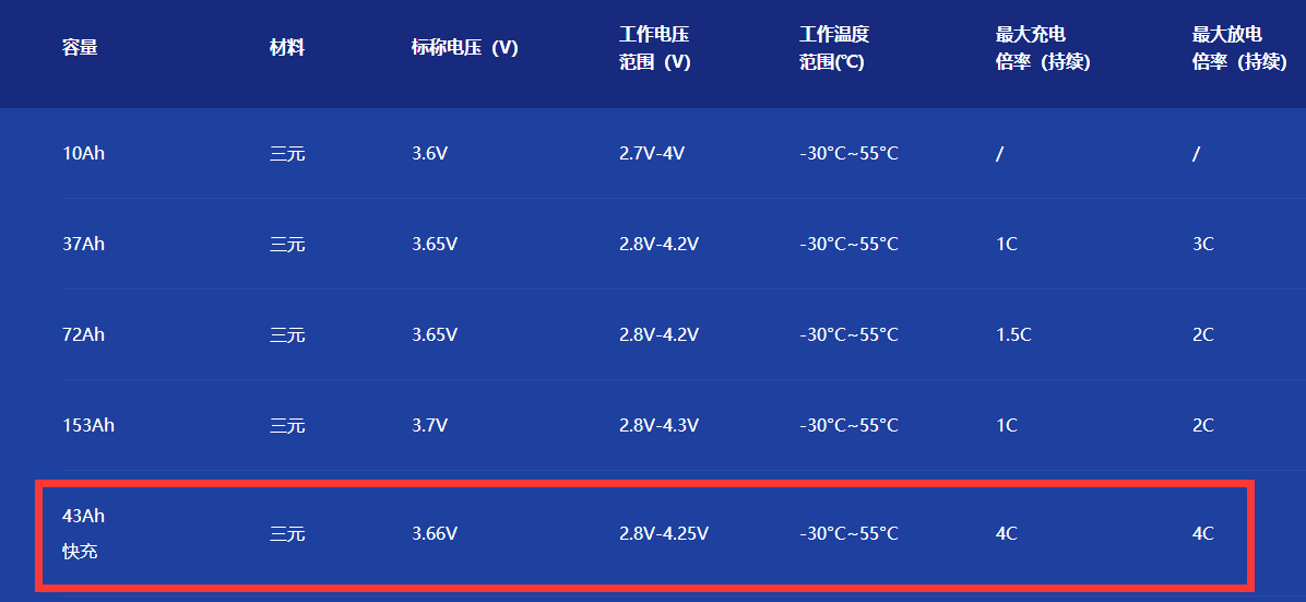 15分钟快充电池,即4倍率(4C)充电锂电池,按照目前的业界标准,能在15分钟内实现0到80%的充电(后续20%无法使用快充)。bte365娱乐线查阅宁德时代观网得知,在宁德时代提供的三元锂电池产品目录中,有一款3.7V 43AH的大单体三元锂电池,持续可充电倍率为4C,应当就是黄世霖所表示的,下半年可出货的15分钟快充电池。