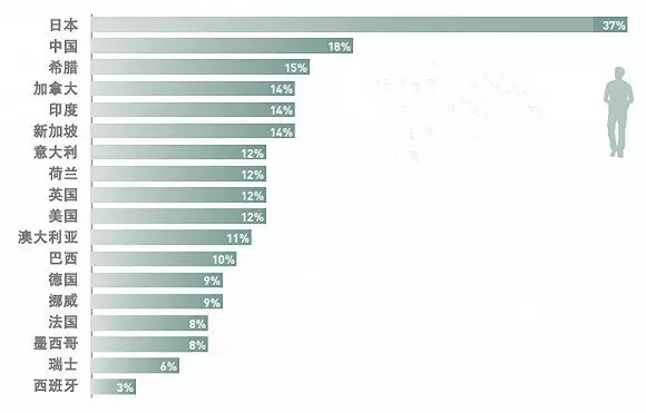研究显示,在这个榜单上排在第一的是日本,该国预计自己将工作到死的人比例高达37%。中国紧随其后,比例为18%。加拿大、印度和新加坡这么认为的人有14%,而好兄弟美国英国在榜单上也并驾齐驱,均为12%。西班牙人明显是最乐观的,仅有3%的人觉得自己会干到死。