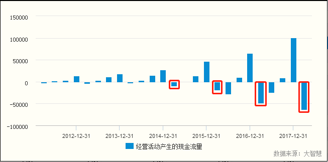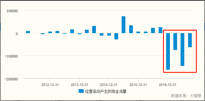 2016年四季度起,乐视网经营性现金流持续为负,且规模巨大。