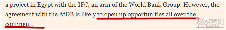 《金融时报》分析称,与非洲开发银行和美洲开发银行共同资助基础设施项目的意图,拓宽了已与亚投行建立合作伙伴关系的多边贷款机构名单。就非洲而言,亚投行已与世行旗下的国际金融公司(IFC)共同资助埃及的一个项目。然而,与非洲开发银行达成的协议有望开启整个非洲大陆的机遇。