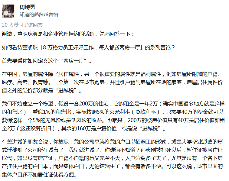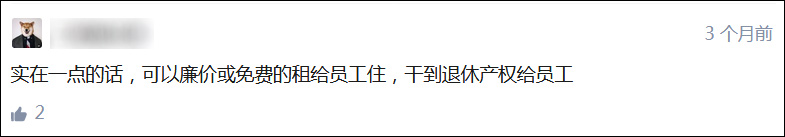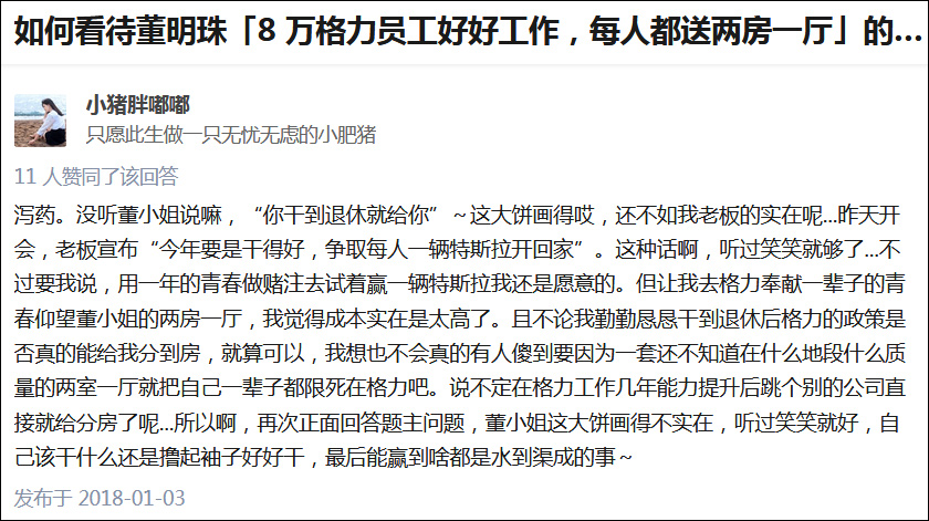 在知乎上,也有网民谈及对董明珠提出给员工每人一套房的看法。大多并不看好,有的谈及格力只解决房子但并不解决相关的福利问题,也有的认为董明珠此举实为画饼,年轻人一般在30岁左右结婚生子,但需要给公司工作一辈子才会有房产。还有建议更为可行的操作:廉价或免费租给员工住,等退休时再给房屋产权。