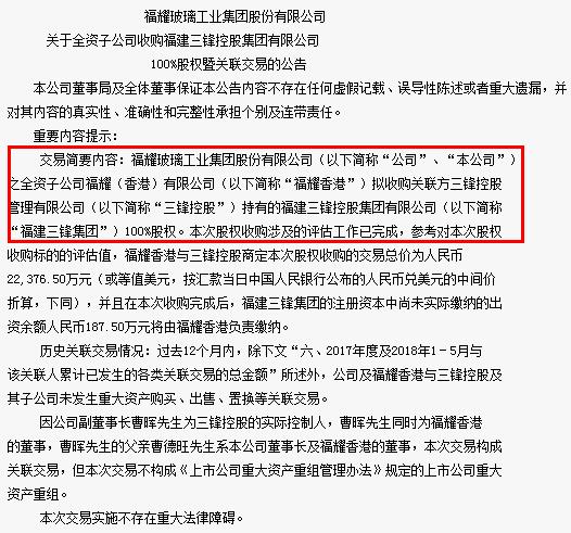 福耀玻璃2.24亿元收购三锋集团 曹德旺:为儿子接班铺路