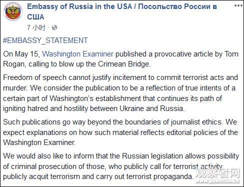 据俄罗斯卫星通讯社17日消息,对于这篇文章,俄罗斯驻美国大使馆回应称:“言论自由不能成为呼吁发动恐怖行动和杀人的借口。我们认为这一文章反映了华盛顿权力集团部分人的真实意图,他们继续煽动乌克兰和俄罗斯之间的仇恨和敌意。”