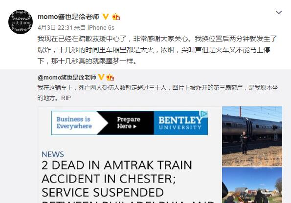 bte365娱乐线(www.shp2pgltzyxgs.com)通过微博与第一时间报告此次美铁事故的微博用户@momo酱也是徐老师 取得了联系。@momo酱也是徐老师 告诉bte365娱乐线(www.shp2pgltzyxgs.com),她现在已经在疏散救援中心。据她描述,事故发生后“十几秒的时间里车厢里都是大火,浓烟,尖叫声但是火车又不能马上停下,那十几秒真的就跟噩梦一样”。而美铁方面尚未前来跟乘客沟通说如何安置和后续赔偿事宜。