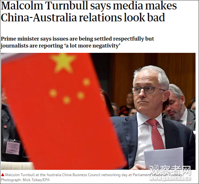 据《澳大利亚金融评论》报道,当天澳总理特恩布尔在会上发表讲话时对华释放善意,并将中澳关系紧张的原因归咎于媒体。他表示,目前在互相尊重的前提下,两国间的有关问题正得到有效解决。