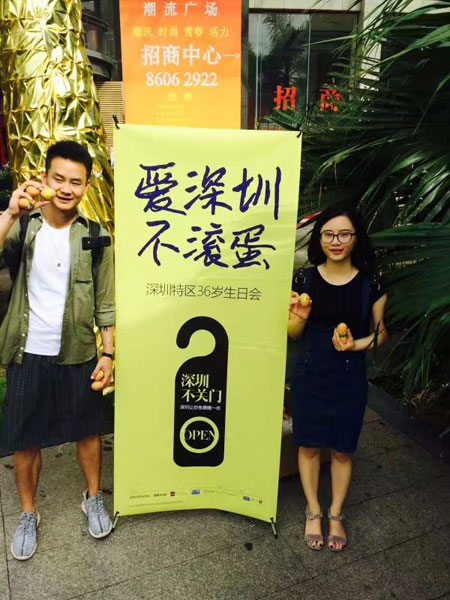 为了宣传这次生日会,施乐乐和她的同事在10个人流最密集的地铁口分发早餐鸡蛋,每一个鸡蛋上都写着“爱深圳,不滚蛋”,他们花了一天的时间,煮熟了8260个鸡蛋。