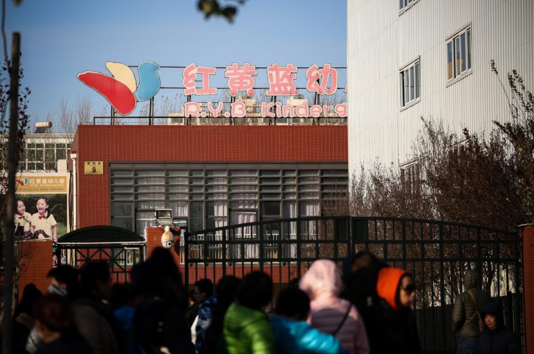 2017年11月24日,部分家长站在北京市朝阳区管庄红黄蓝幼儿园(新天地分园)大门外等候。(图/东方IC)
