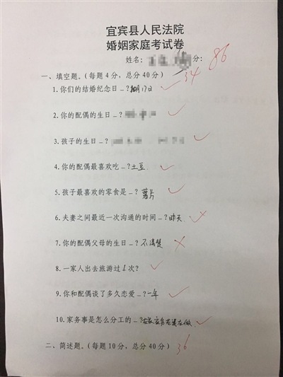 在上述离婚案中,通过这份试卷,主审法官王士雨认为找到了症结。“男的爱赌博,有时会辱骂女方,还缺乏家庭责任感,这确实是较大的过错,但不是原则性的。从分数也能看出来,两人的感情基础还是有。”