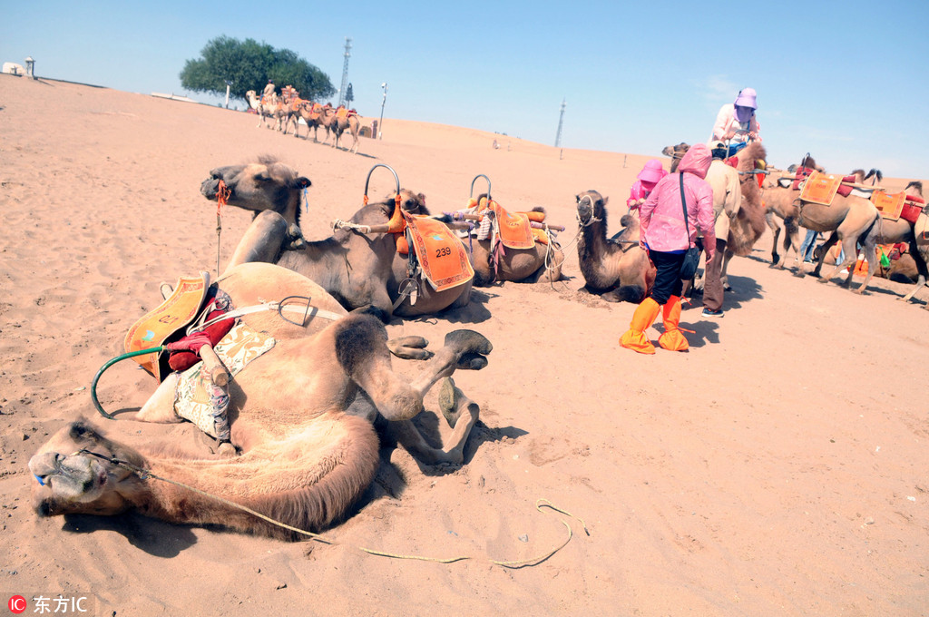 2017年7月24日,甘肃省敦煌迎来旅游高峰,鸣沙山景区特色旅游项目骑骆驼备受青睐。目前有1000峰骆驼专业服务游客,每天5时半到天黑马不停蹄,一峰骆驼一天来回送客人,但还是不能满足景区近段时间每天上万名游客选择这个旅游项目的需要。一游客说,大量游客涌入,很多骆驼都累趴下了。在旅游产业兴旺的同时,我们也该考虑动物的感受。@东方IC
