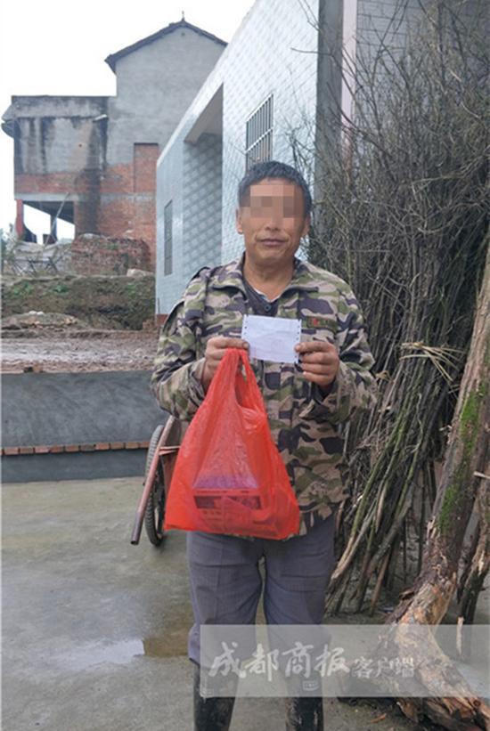 一位村民展示他买的药品和费用单。