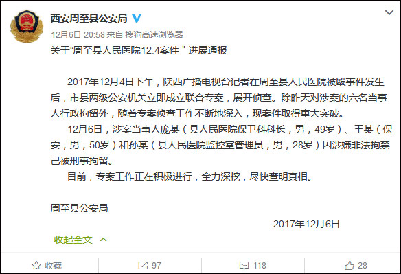 关键字: 天价停尸费天价停尸费殴打记者据陕西省西安市周至县公安局官方微博@西安周至县公安局12月6日消息,2017年12月4日下午,陕西广播电视台记者在周至县人民医院被殴事件发生后,市县两级公安机关立即成立联合专案,展开侦查。除昨天对涉案的六名当事人行政拘留外,随着专案侦查工作不断地深入,现案件取得重大突破。