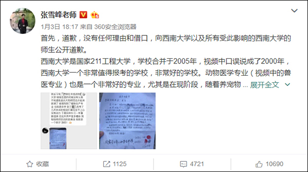 1月3日晚,张雪峰在私人微博“@张雪峰老师”中公开发文道歉:“首先,道歉,没有任何理由和借口,向西南大学以及所有受此影响的西南大学的师生公开道歉。”