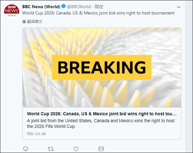 关键字: 世界杯据英国广播公司(BBC)6月13日消息,国际足联官方宣布美国、加拿大、墨西哥三国成为2026年世界杯举办国。