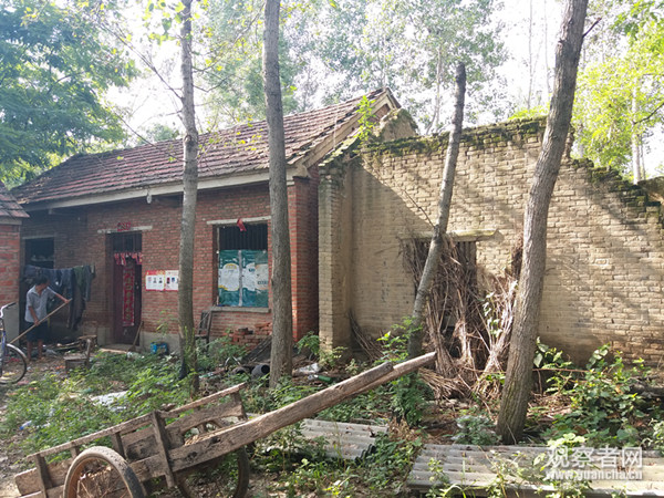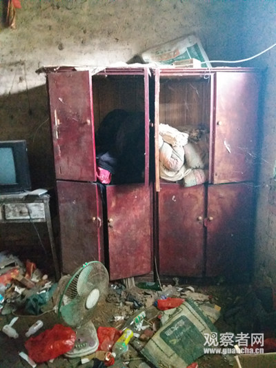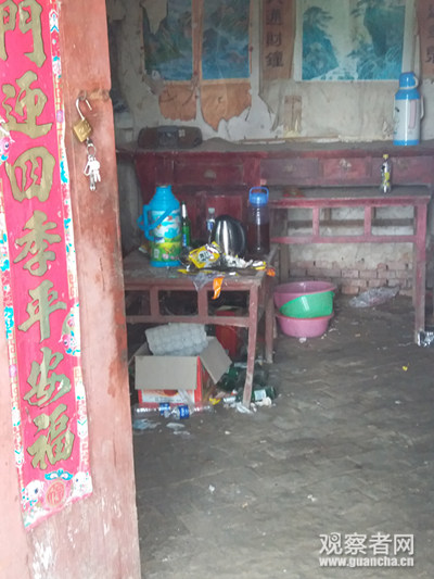 8月11日下午,笔者随同驻村第一书记来到贫困户关民家里,关民家的门楼房顶已经坍塌,正对着门的三间青砖瓦房也凌乱地倒在地上,旁边是三间红砖瓦房,东边是两间厨房,厨房靠外边一间的房顶已经露天了,关民在里面一间煮饭。对关民来说,煮饭是件挺麻烦的事情,他更喜欢吃泡面。正屋里一片狼藉,桌子上摆着开水瓶和吃剩下的方便面调料包,卧室里分不清哪里是垃圾堆,哪里是卧室,剥落的柜子上摆着一台黑白电视机。