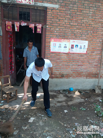 由于屋里屋外实在无法下脚,关民也找不到一条没有落满灰尘的凳子来,第一书记忙着为他打扫卫生,帮他把门前厚达三公分的树叶粪肥铲去,再将他扔了一地的烟头扫开,书记一边帮他打扫,一边告诉他,“扶贫不扶懒,你这样可不行”。